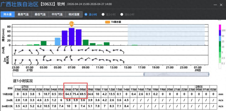 再看区域站,雨量更是惊东说念主。像钦州一中站以前24小时的累计雨量已达410.4毫米,其中短时强降雨特色相配突出!今天05时-06时73.5毫米,06时-07时124毫米、07时-08时又有99.9毫米,短短3小时雨量就有297.4毫米,如斯强降雨额外迥殊!(注,按散漫圭臬24小时雨量≥250毫米为特大暴雨。)
