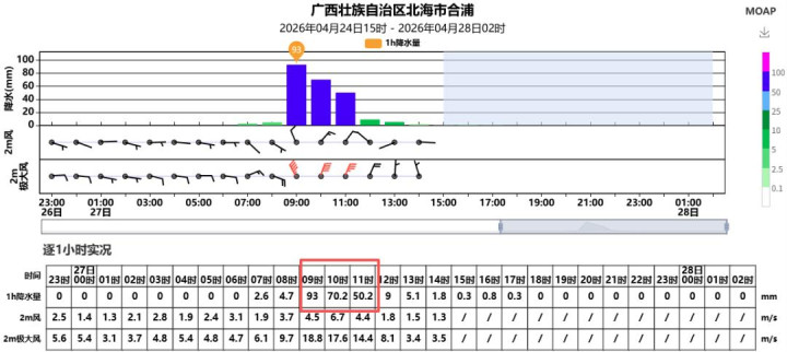 不仅是钦州,在其东侧的合浦,今天也出现了强横降雨,今天9时-14时雨量已达229.3毫米,其中08时-09时的单小时雨量93毫米,雷同惊东说念主!