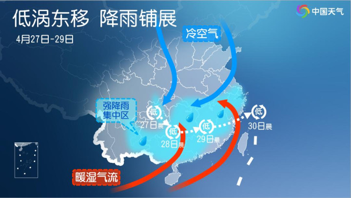 之后,4月30日至5月3日,新一轮大畛域降雨天气又将上线,其中江南、华南中北部等地有大到暴雨,局地并伴有雷暴大风、短时强降水等强对流天气,强降雨时段主要在5月2-3日。