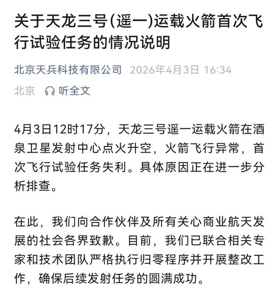 今天中午天龙3号的辐射失利了,刚刚天兵科技官方仍是发文回答,说念阻且长,恭候后续的访问效果了。