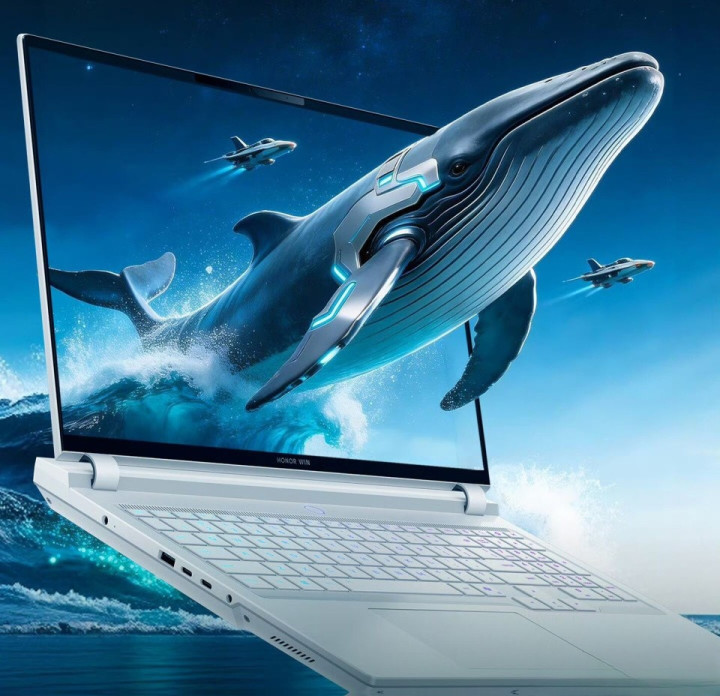 荣耀WIN游戏本 :白色游戏本,屏幕显露机械鲸鱼