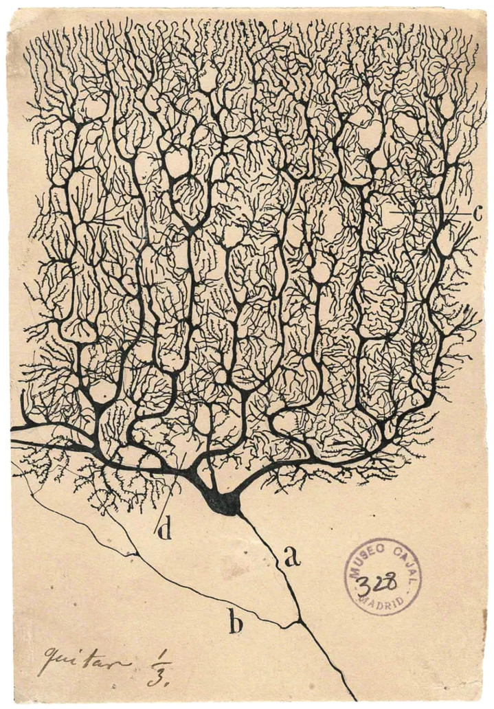 圣地亚哥·拉蒙·卡哈尔画图的神经元图,举例这幅带有分支树突的浦肯野细胞图,促使他提倡了神经系统包含很多相互作用的细胞的表面。圣地亚哥·拉蒙·卡哈尔/人人限制