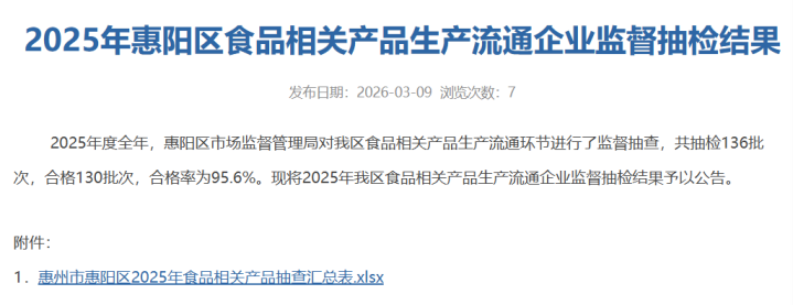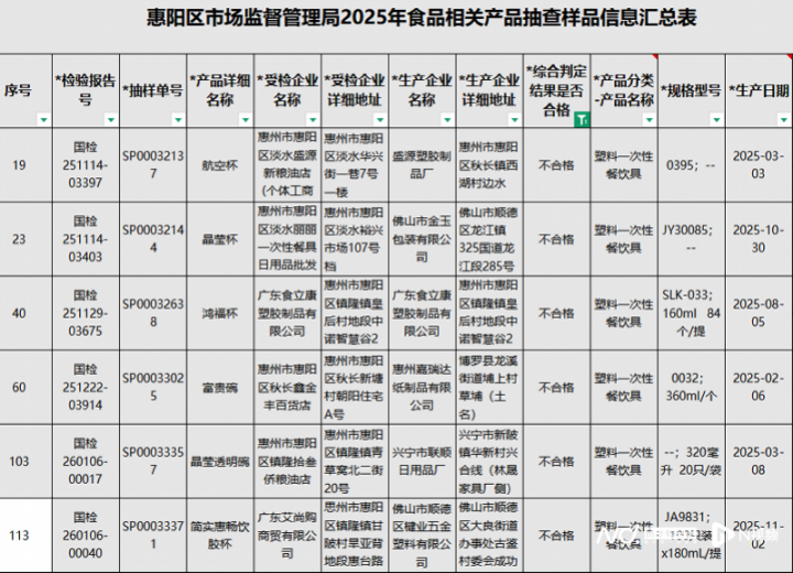 不仅仅食物药品安全备受保重,与食物相关的种种居品安全也相同密切关乎着匹夫的健康。近日,惠阳区市集监督惩办局公布“2025年食物相关居品分娩泄露企业监督抽检成果”。2025年,该局对辖区食物相关居品分娩、泄露步调开展监督抽查,共抽检136批次,涵盖塑料一次性餐饮具、复合膜袋等多个品类,及格130批次、及格率95.6%,其中6批次塑料一次性餐饮具分别格,波及多家销售及分娩企业。