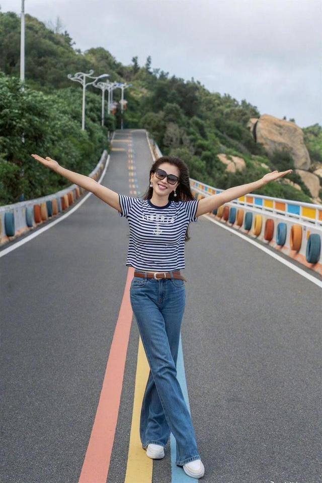 下身搭配蓝色的牛仔阔腿裤,这种裤子几乎是梨形骸格的救星,推选中年女性给我方安排上,高腰的剪裁显高又显比例,阔腿的版型更是超包容,能完满遮住大腿和小腿的肉肉,垂坠感超棒,走路的时辰裤腿轻轻舞动,自带洒脱气场,搭配小白鞋,逍遥感拉满,走在海边摧毁一拍齐是大片,温文又即兴。