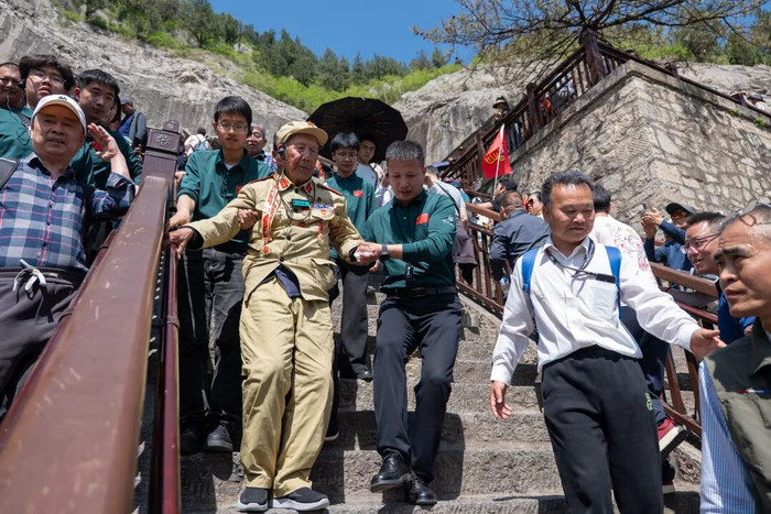 “咱们搀扶着他爬了一半,远遥望了看”,陈红说,约略爬10个台阶,老兵就要休息一会,好多旅客看到后高歌:给爷爷让一让!旅客纷纷让出一条通说念。