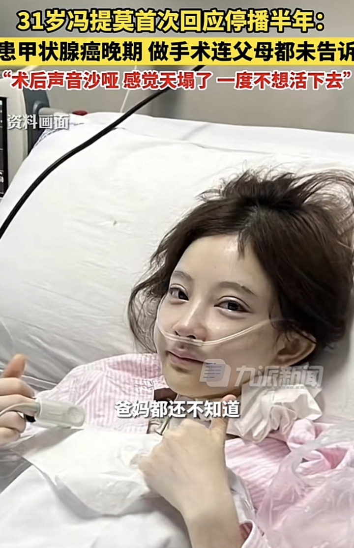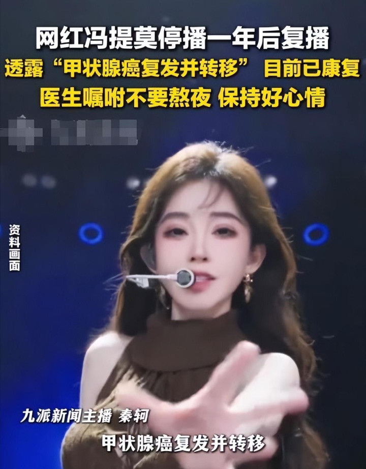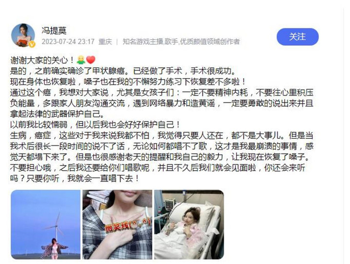 2023年7月,冯提莫自曝确诊甲状腺恶性晚期,已完成手术,却濒临声带受损、无法再唱歌的罪恶践诺。