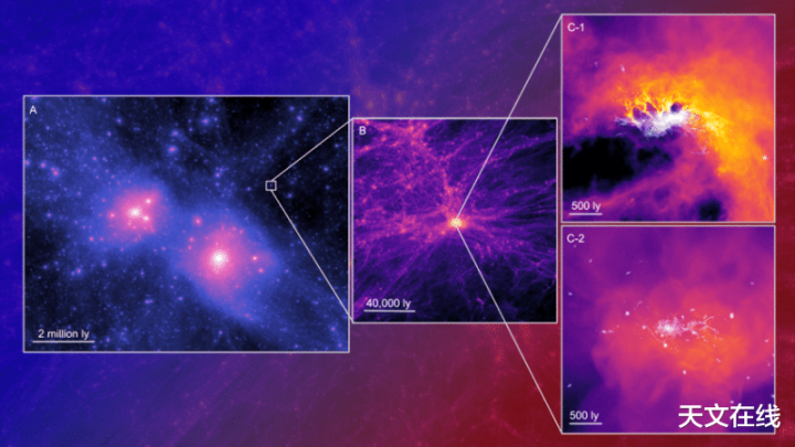 图A暴露了咱们天地周边区域的暗物资散播图。这两个团块是星河系和少女座星系的暗物资晕。图B放大后展示了天地大爆炸后约7亿年的一个袖珍暗物资团块。C1和C2是模拟的超暗矮星系中的恒星热心体。它们暴露了天地大爆炸后不久的不同辐照水平。超暗矮星系的性质会字据所使用的辐照类型而变化。每张图像的比例尺单元是光年。图片开头:皇家天文体会J苏雷达A法塔希S布朗S亚伯拉罕(CCBY4.0)。